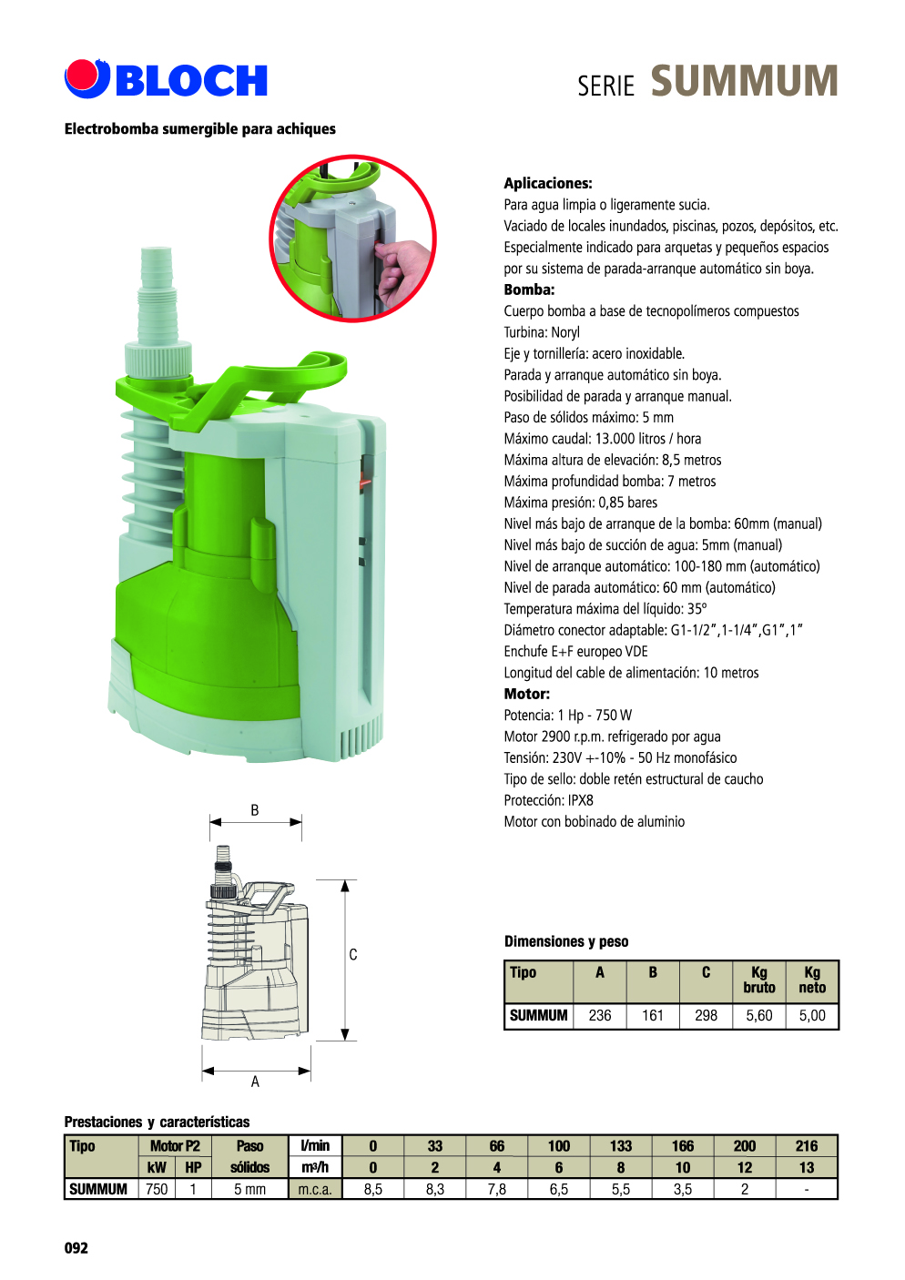 Bomba: Cuerpo bomba a base de tecnopolímeros compuestos Turbina: Noryl Eje y tornilleria: acero inoxidable. Parada y arranque automático sin boya. Posibilidad de parada y arranque manual. Paso de sólidos máximo: 5 mm Máximo caudal: 13.000 litros / hora Máxima altura de elevación: 8,5 metros Máxima profundidad bomba: 7 metros Máxima presión: 0,85 bares Nivel más bajo de arranque de la bomba: 60mm (manual) Nivel más bajo de succión de agua: 5mm (manual) Nivel de arranque automático: 100-180 mm (automático) Nivel de parada automático: 60 mm (automático) Temperatura máxima del Iquido: 35° Diámetro conector adaptable: G1-1/2″, 1-1/4″,G1″, 1″ Enchufe E+F europeo VDE Longitud del cable de alimentación: 10 metros Motor: Potencia: 1 Hp -750 W Motor 2900 r.p.m. refrigerado por agua Tensión: 230V +-10% – 50 Hz monofásico Tipo de sello: doble retén estructural de caucho Protección: IPX8 Motor con bobinado de aluminio.