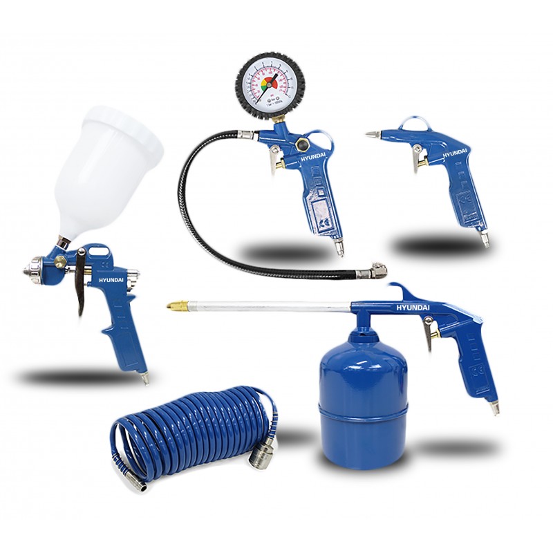 Este conjunto de accesorios para compresor Hyundai consta de la herramientas neumáticas más usadas, y por lo tanto, es el complemento ideal para un compresor. Este conjunto consiste en una pistola rociador de copa superior, un rociador de líquidos, y una pistola de llenado de neumáticos, una pistola de soplado y una manguera en espiral.