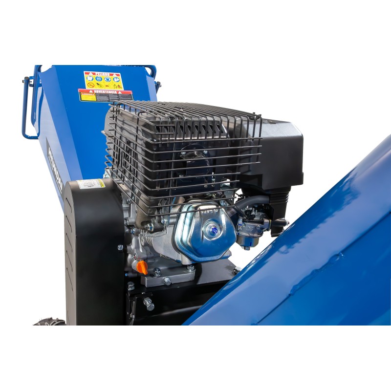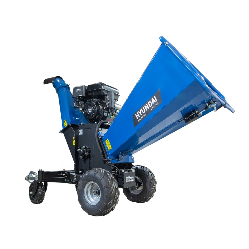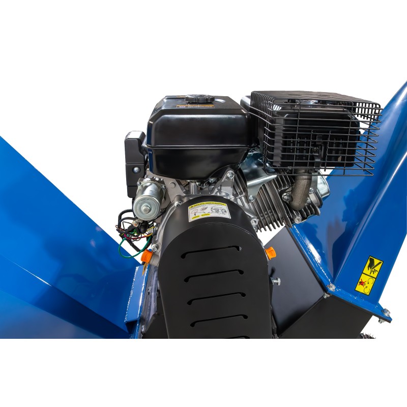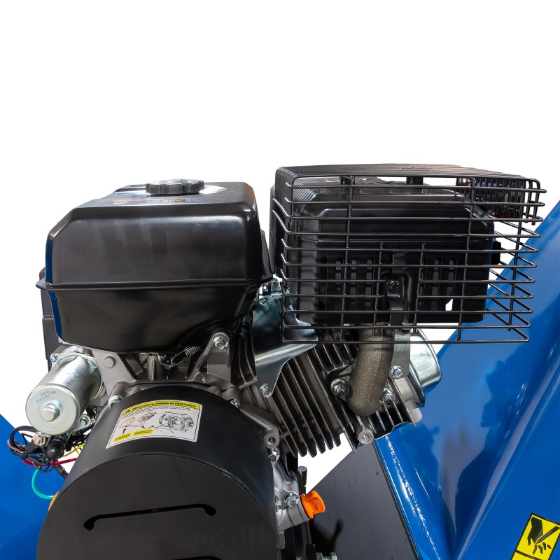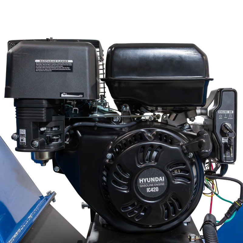 Astilladora HYAST350-PRO de gasolina con motor de 15HP y sistema de tambor de doble hoja en acero endurecido. Certificación TUV CE, capacidad de astillado de 6″ (15 cm), tolva 360º y arranque eléctrico/manual. Rendimiento profesional para trabajos exigentes.